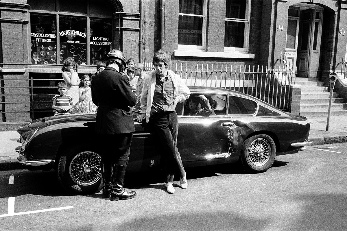 - Mick Jagger krijgt een bon na een aanrijding in zijn gloednieuwe Aston Martin - foto Archief The Daily Mirror 1967