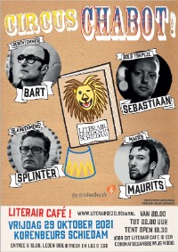 Bart Chabot en zijn zonen Splinter, Sebastiaan en Maurits treden op in Circus Chabot. Tijdens dit literair café zal worden voorgelezen, geïnterviewd en gesproken. Het belooft een boeiende avond te worden: 4 schrijvers met elk hun eigen aanpak, thema’s en inspiratiebronnen.