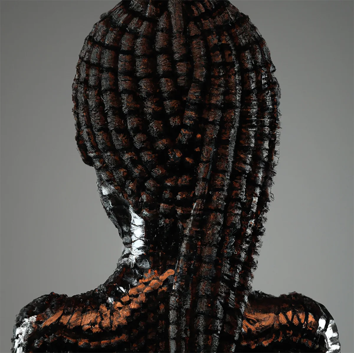 Modeontwerper Marga Weimans presenteert de ruimtevullende installatie The 4c Body. Weimans experimenteert discipline-overstijgend met materiaal, couture, architectuur en digitale technologie. In haar installatie staan de poëtische en familiale betekenissen van haar eigen afro-haartype, dat gecategoriseerd is als 4c, centraal. De familie in de installatie wordt bevolkt door Weimans eigen verwanten en AI-gegenereerde cyborgs.