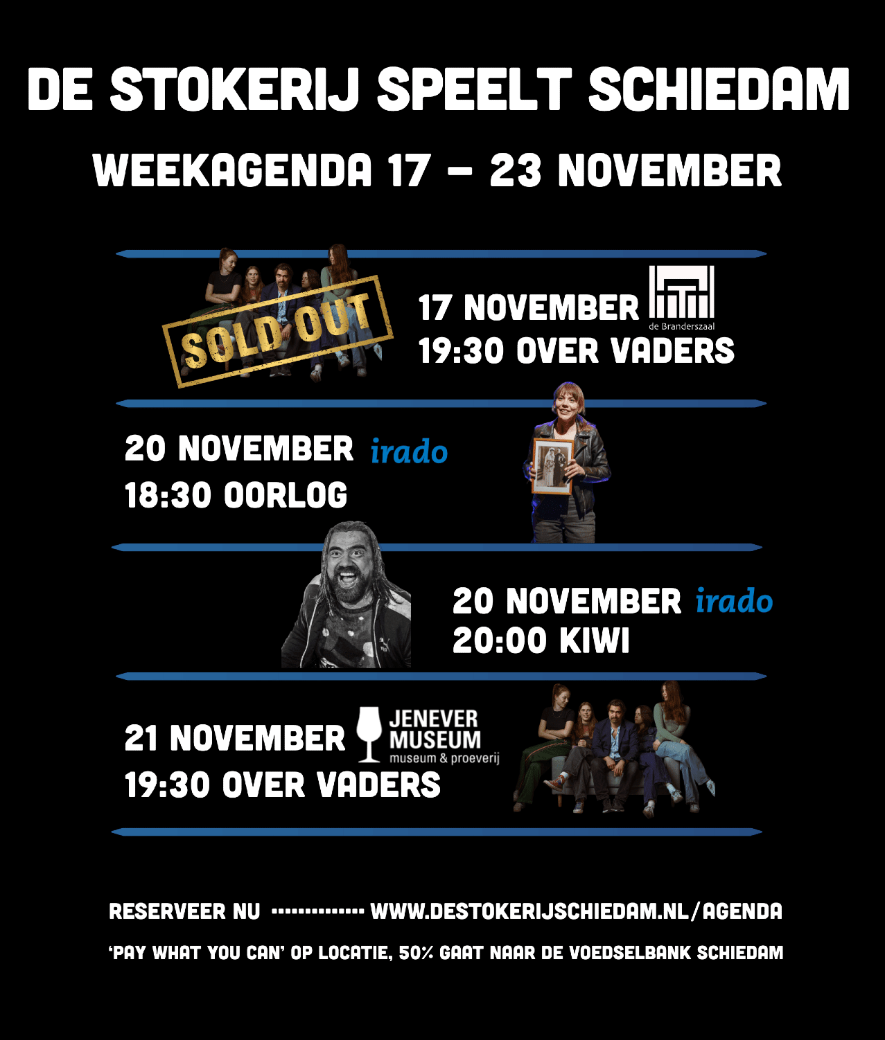 Met dit initiatief willen Koen en Anne theater dichtbij de inwoners van Schiedam brengen. De voorstellingen worden gespeeld op bijzondere locaties door de hele stad, volgens het 'pay what you can'-principe: bezoekers bepalen zelf wat zij kunnen en willen betalen. 50% van de opbrengst gaat naar Stichting Voedselbank Schiedam, die zich inzet voor Schiedammers die door financiële nood niet kunnen voorzien in hun primaire voedselbehoefte.