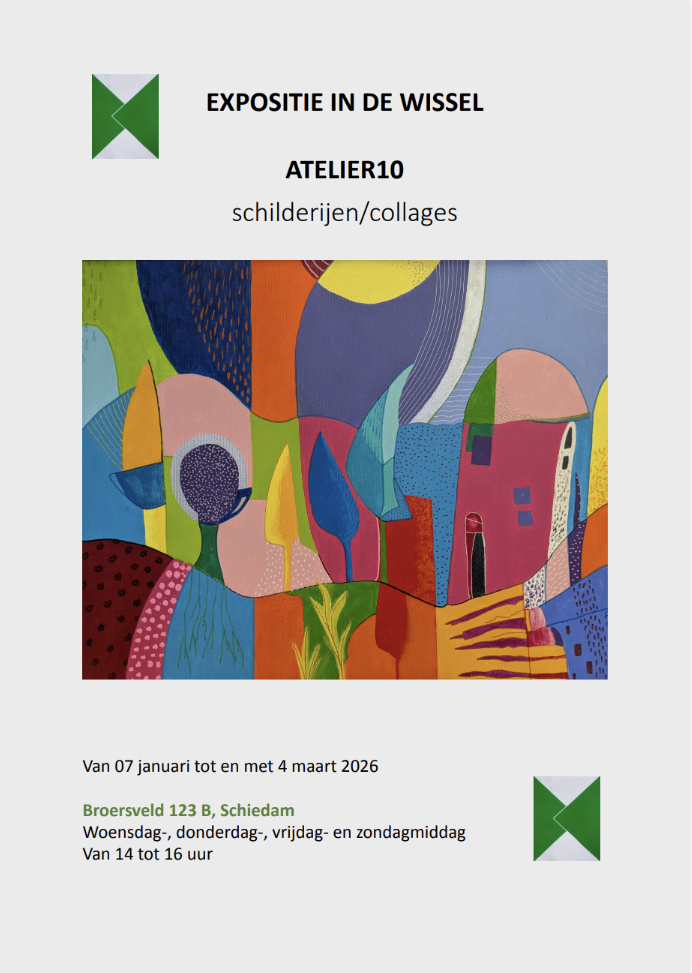 Van 7 januari tot en met 4 maart 2026 is in De Wissel Schiedam een nieuwe expositie te bewonderen. Deze tentoonstelling wordt verzorgd door schildersgroep Atelier10, verbonden aan cultuurhuis Kade 40 in Vlaardingen. Bezoekers krijgen de kans om zich te laten verrassen door het veelzijdige werk van deze kunstenaarsgroep.