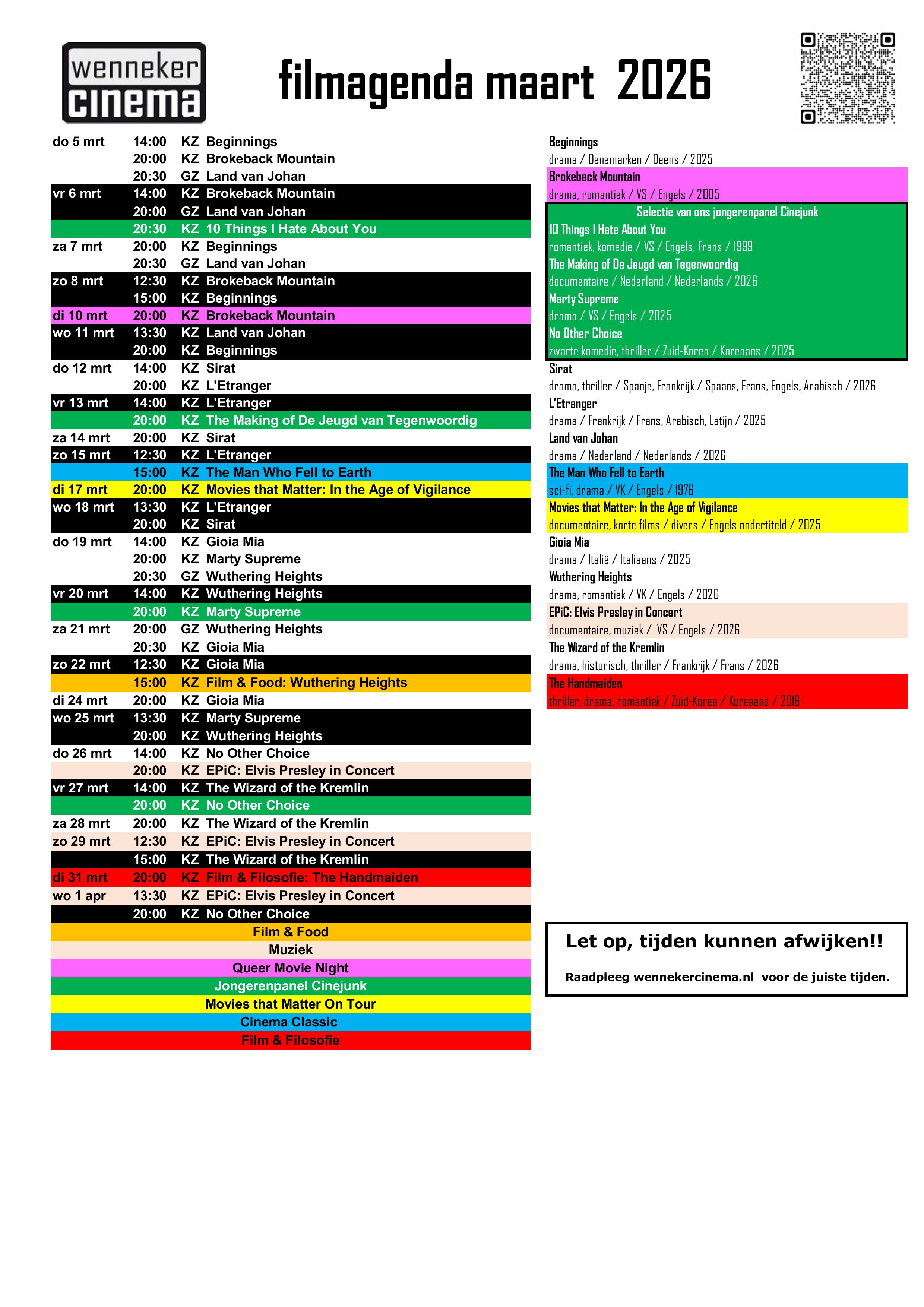 Waar: Wenneker Cinema, Vijgensteeg 2 Wanneer: Maand MAART (6 maart t/m 2 april) Tickets: klik hier voor de ticketprijzen Check ook de Wenneker Cinema.nl Heel relaxt een bioscoopje pakken kan in hartje centrum Schiedam in Wenneker Cinema. Van dinsdag tot en met zondag kijk je naar arthouse en populaire films.