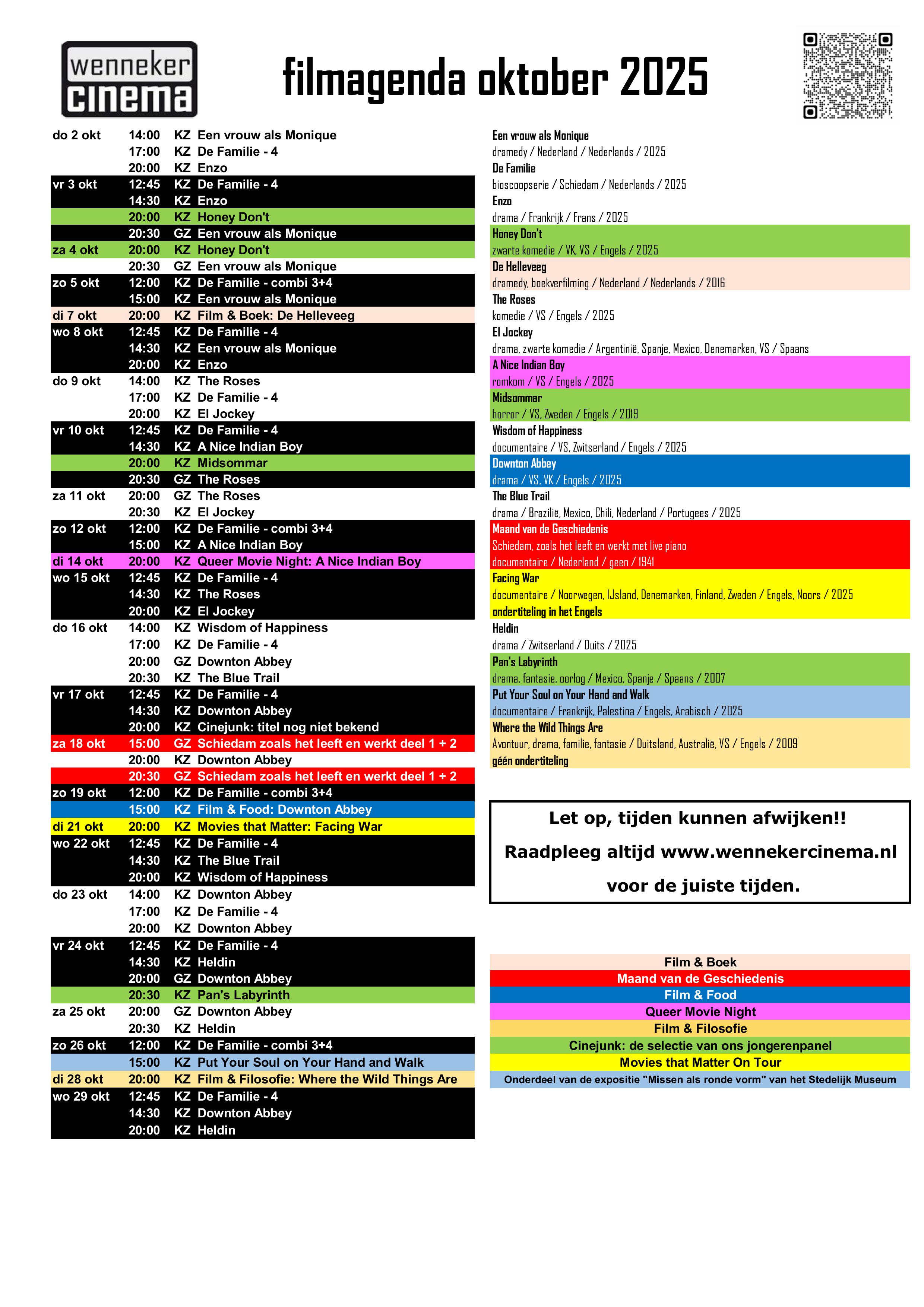 Waar: Wenneker Cinema, Vijgensteeg 2 Wanneer: Maand OKTOBER Tickets: klik hier voor de ticketprijzen Check ook de Wenneker Cinema.nl Heel relaxt een bioscoopje pakken kan in hartje centrum Schiedam in Wenneker Cinema. Van dinsdag tot en met zondag kijk je naar arthouse en populaire films.