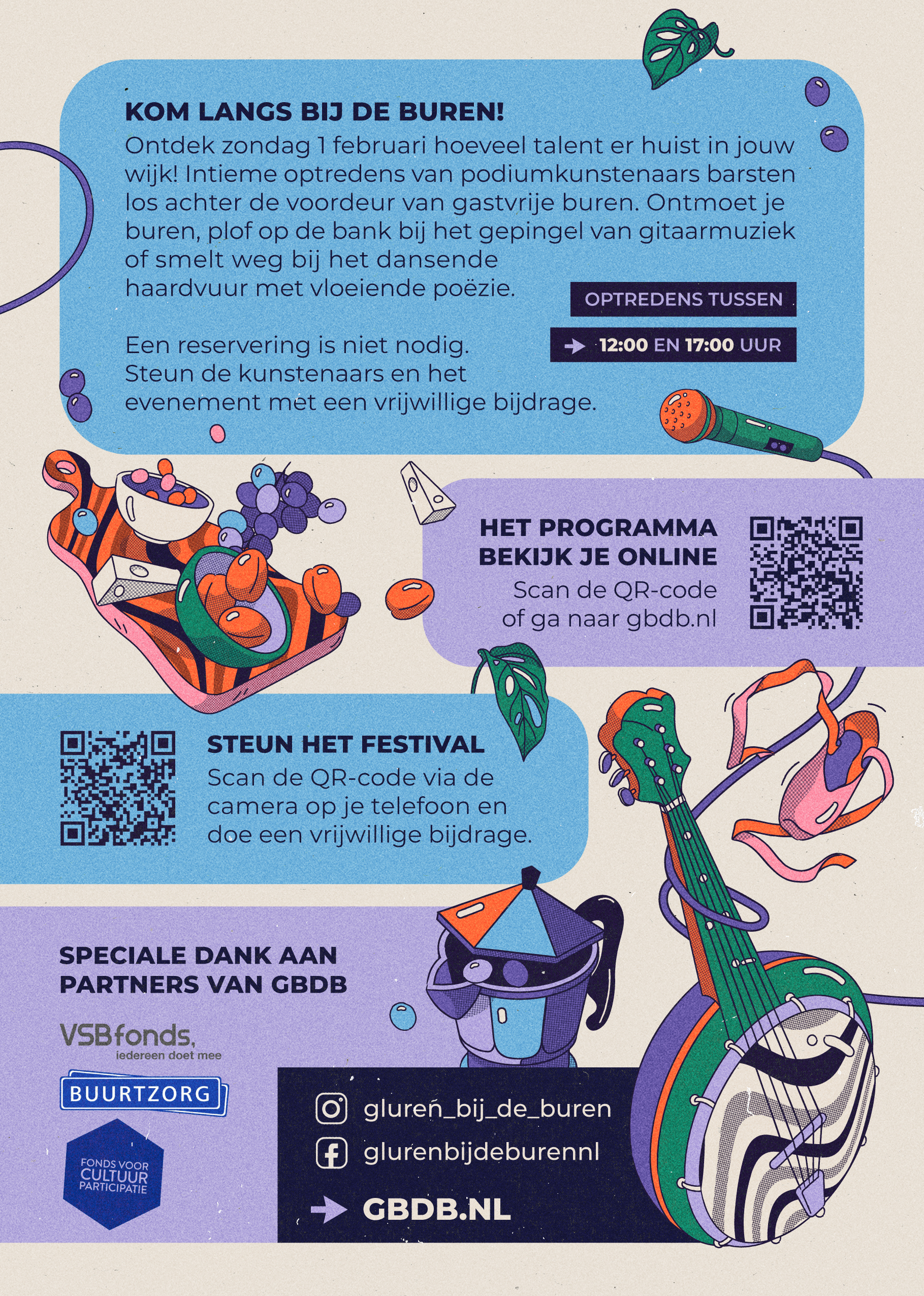 De Buurtjes: Goede vrienden en buren die elkaar gevonden hebben in de muziek. Door de bijzondere samenstelling van zang, gitaar, sax, ukelele, bluesharp en chromaat worden covers op een bijzondere manier gespeeld. Van Americana via Mornas naar de Blues.