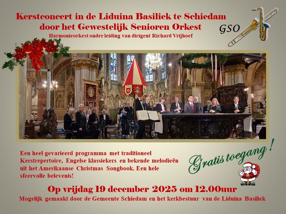Geniet vrijdag 19 december van het sfeervolle kerstconcert in de Liduina Basiliek door het Gewestelijk Senioren Orkest Harmonieorkest onder leiding van dirigent Richard Vrijhoef.