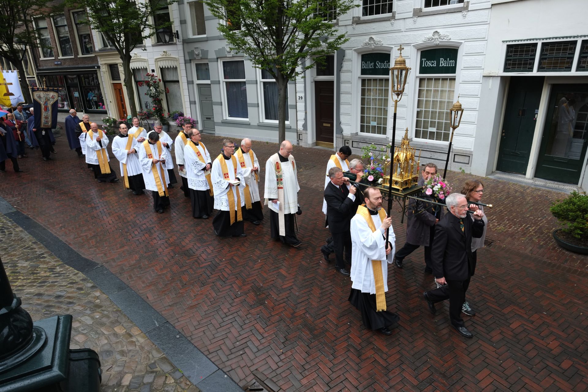 Een aantal priesters en misdienaars lopen in de processie mee. En daarnaast de ‘gewone’ deelnemers, die samen zingen en bidden.