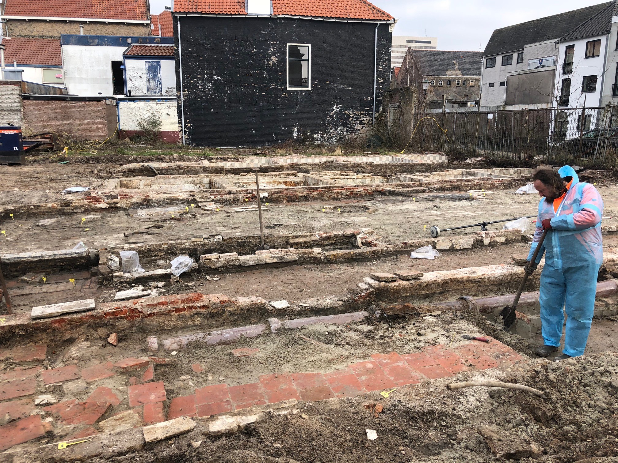 Ook ondergronds is het jeneververleden aanwezig: de foto toont de archeologische vondsten tijdens fase 1, van kelders, oude funderingen en (houten) vaten. Alle onderdeel van het vroegere distilleerproces. Het uitgangspunt bij archeologie is documenteren en zo veel mogelijk ‘in situ’ behouden. Daarom worden er, met zo min mogelijke verstoring, foto’s en tekeningen gemaakt en bijzondere vondsten schoongemaakt en gearchiveerd zodat alles straks weer toegedekt kan worden door een grote laag zand!