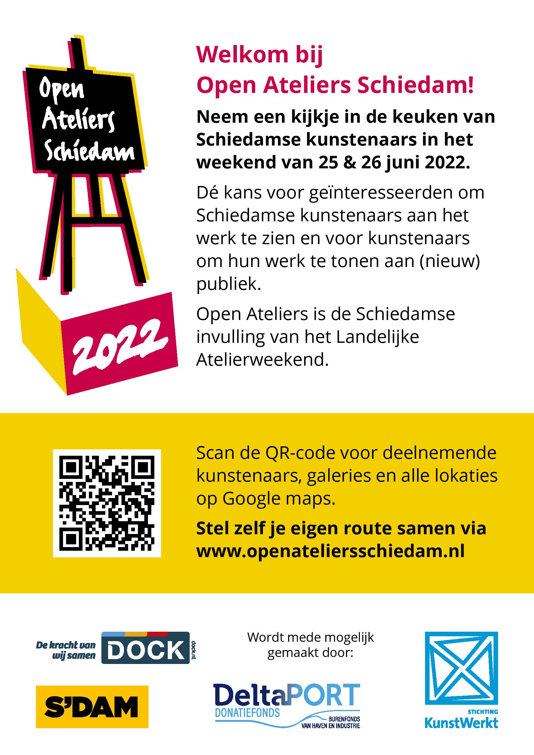 Tijdens dit weekend stellen Schiedamse (beroeps)kunstenaars hun atelier open. Dit is je kans voor om kunstenaars aan het werk te zien. En voor Schiedamse kunstenaars is het de de kans om hun werk te tonen aan (nieuw) publiek