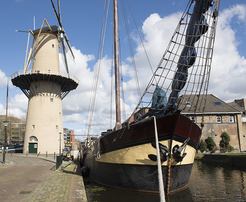 Molen De Kameel is met 30,5 meter hoogte tot bovenkant kap geen kleine jongen. Toch oogt de molen bescheiden naast de andere windreuzen die Schiedam nog rijk is.