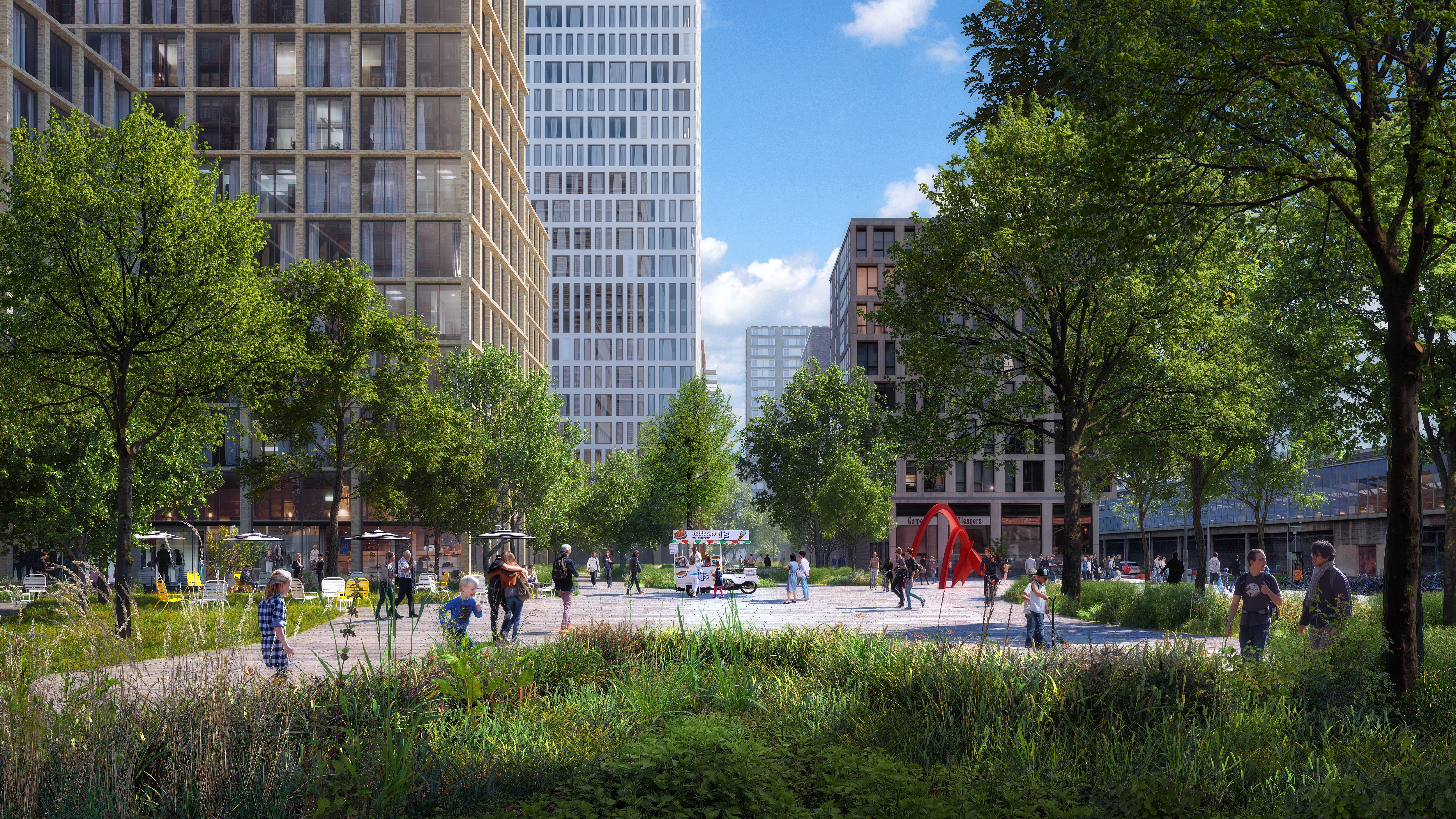 Deze enfilade wordt een levendige plek, waar de toekomstige bewoners en bezoekers van Schieveste elkaar ontmoeten. Op de begane grond van PRELUDE komt dan ook een gezellige horecagelegenheid.